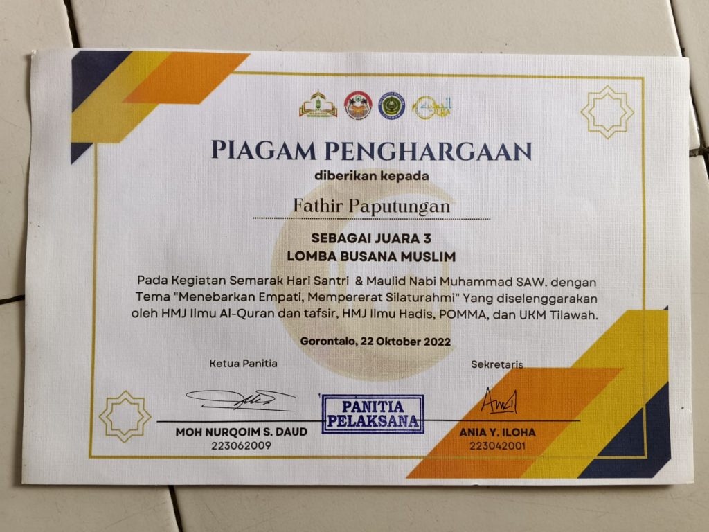 Mahasiswa Program Studi Akuntansi Syariah, Fakultas Ekonomi dan Bisnis Islam, IAIN Sultan Amai Gorontalo, Fathir Paputungan, berhasil meraih Juara III pada Lomba Busana Muslim dalam rangkaian kegiatan Semarak Hari Santri dan Maulid Nabi Muhammad SAW Tahun 2022. Prestasi ini menjadi salah satu capaian mahasiswa dalam bidang non-akademik tingkat lokal yang menunjukkan keterlibatan aktif mahasiswa dalam berbagai kegiatan kemahasiswaan.