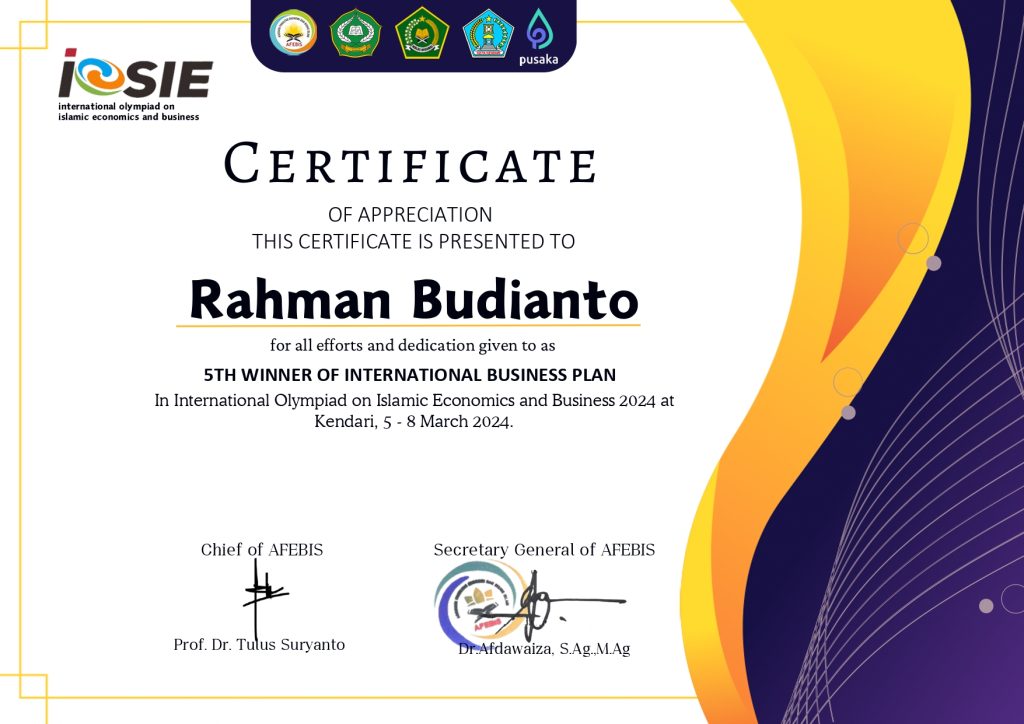 Gorontalo — Mahasiswa Program Studi Akuntansi Syariah, Fakultas Ekonomi dan Bisnis Islam, IAIN Sultan Amai Gorontalo, Rahman Budianto berpartisipasi dalam ajang akademik bergengsi tingkat internasional, yaitu International Olympiad on Islamic Economics and Business 2024 yang diselenggarakan pada tahun 2024.
