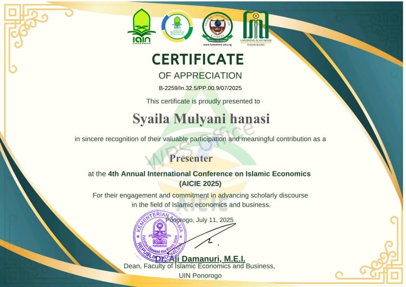 Gorontalo, 11 Juli 2025 – Prodi Akuntansi Syariah Fakultas Ekonomi dan Bisnis Islam IAIN Sultan Amai Gorontalo kembali mencatatkan prestasi gemilang di tingkat internasional. Syailla Mulyani Hanasi, salah satu dosen terbaik di prodi ini, baru saja menerima penghargaan “Certificate of Appreciation” atas kontribusinya sebagai presenter dalam The 4th Annual International Conference on Islamic Economics (AIICE 2025).